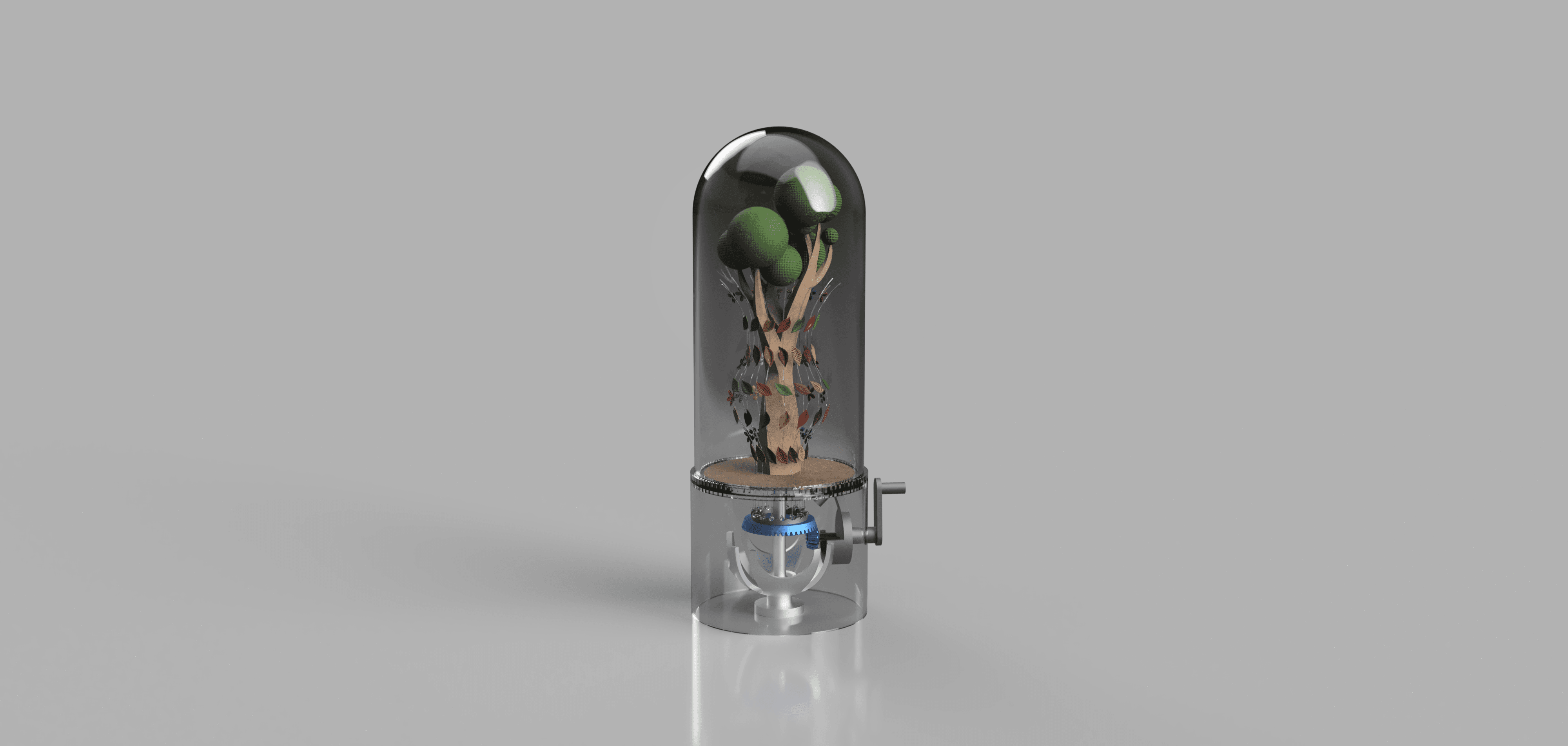 A tree automaton using Geneva drive, modeled and rendered in Fusion 360.