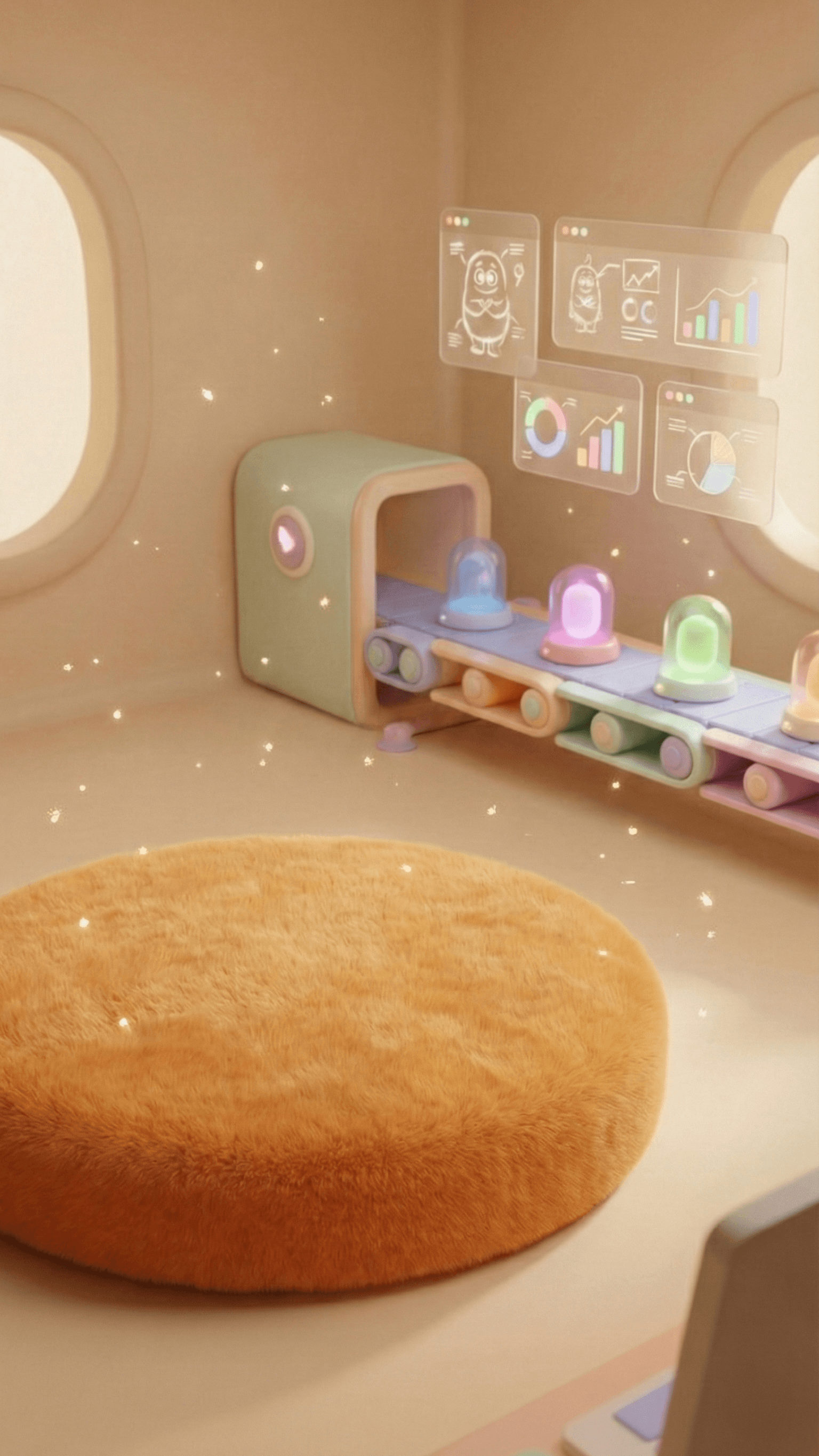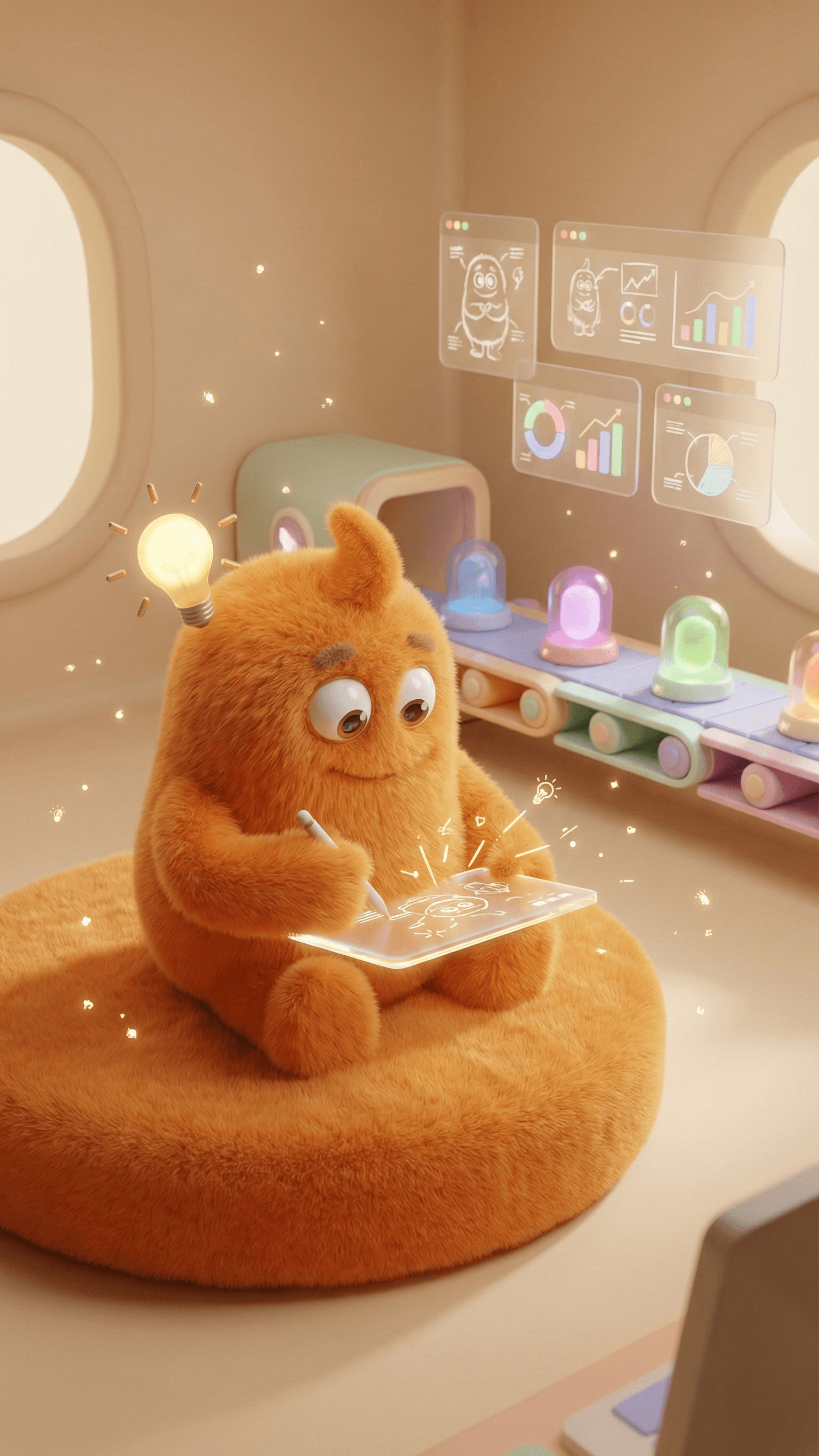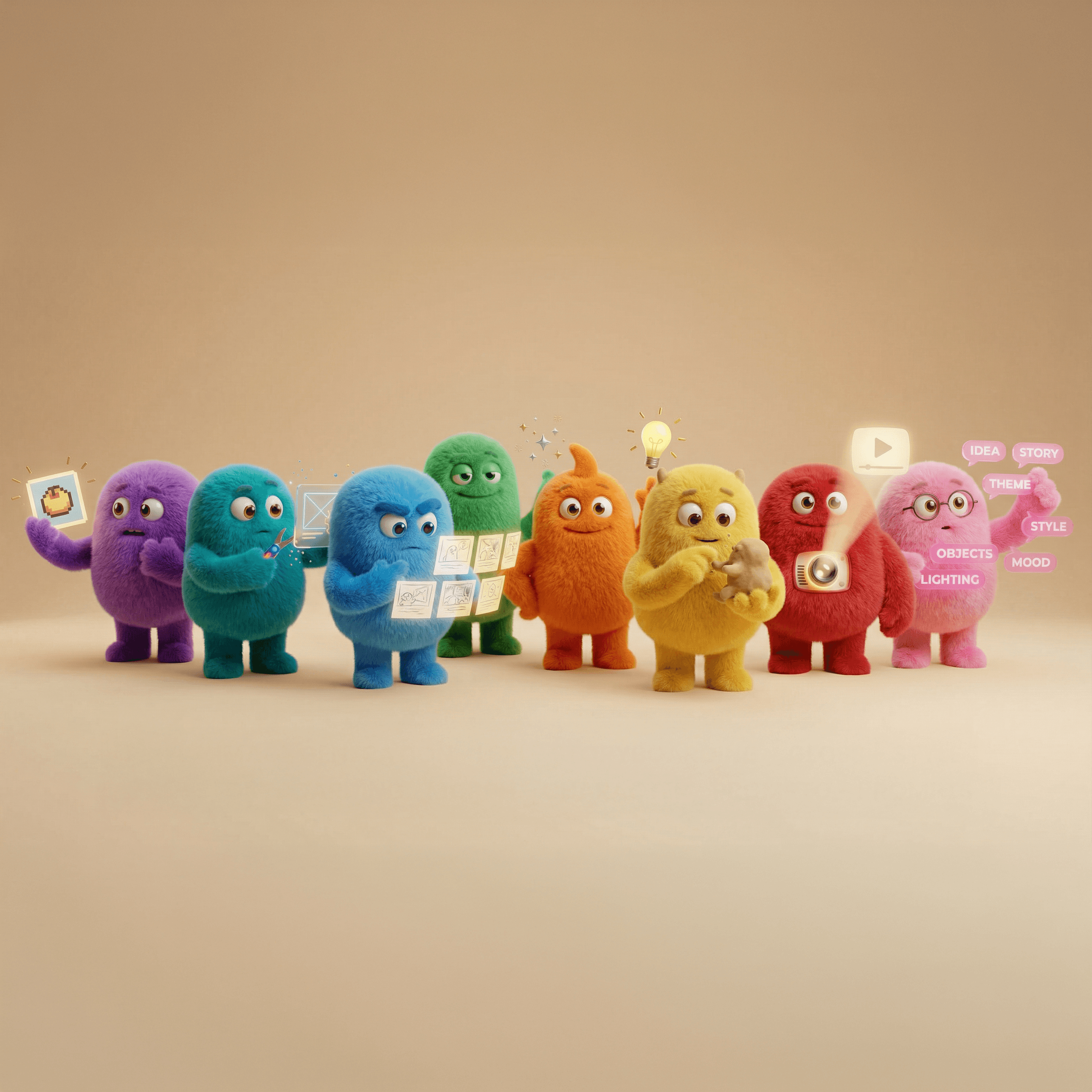 Creative Factory reimagines that process as a playful animated world. Instead of interfaces and menus, the creative pipeline becomes a cast of fluffy monster characters, each representing a different stage of the workflow, working together inside a cozy pastel factory.