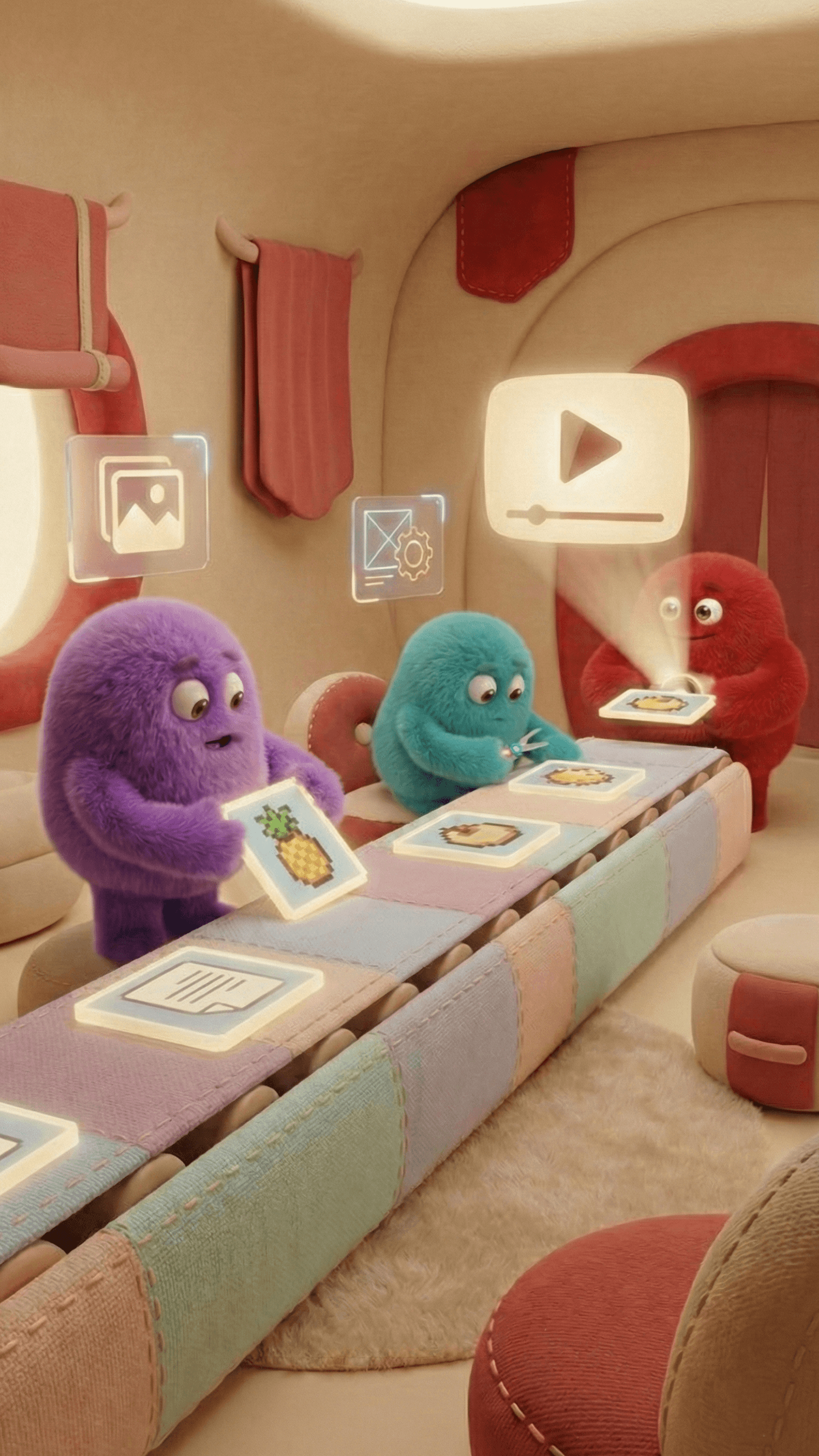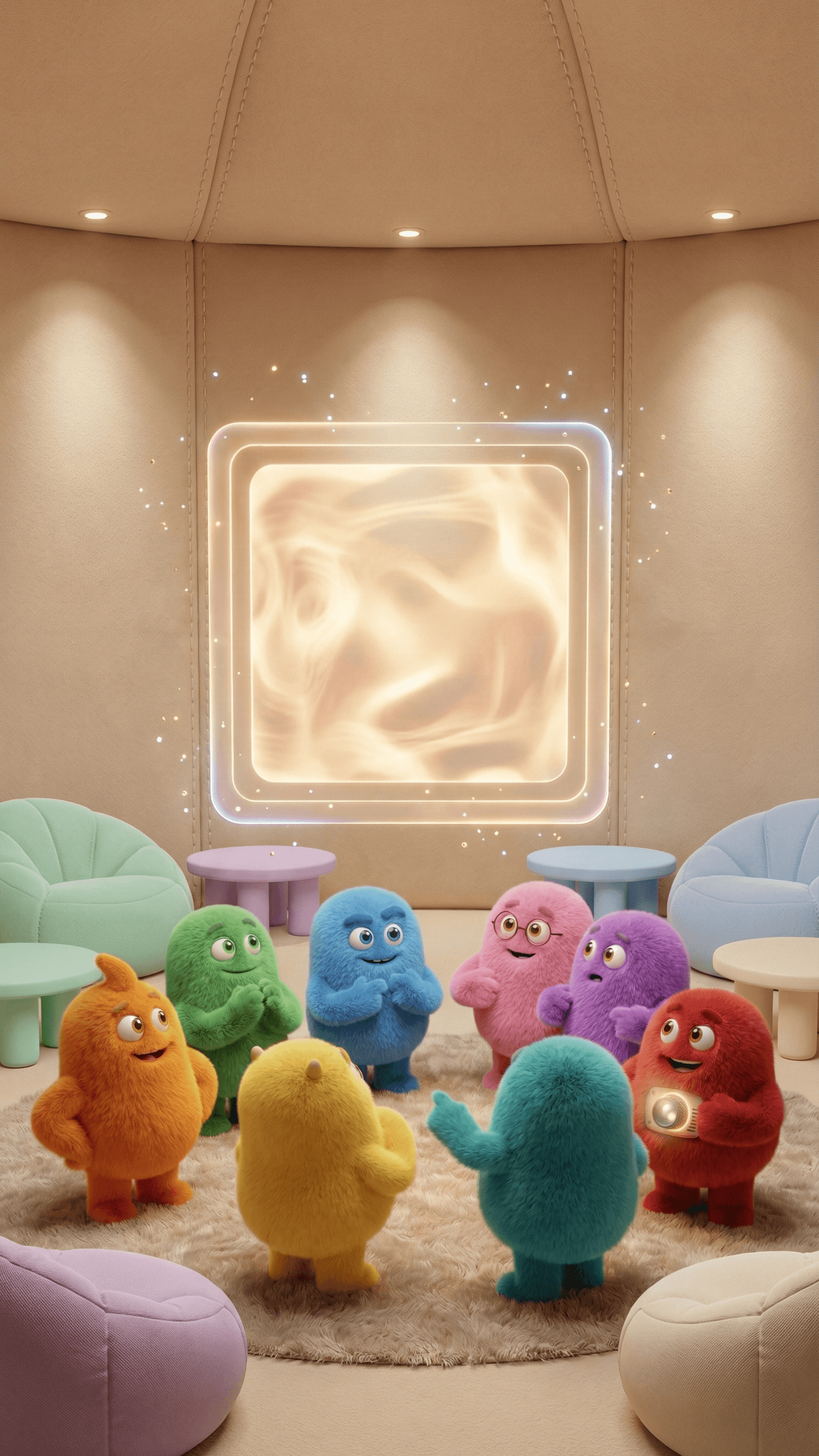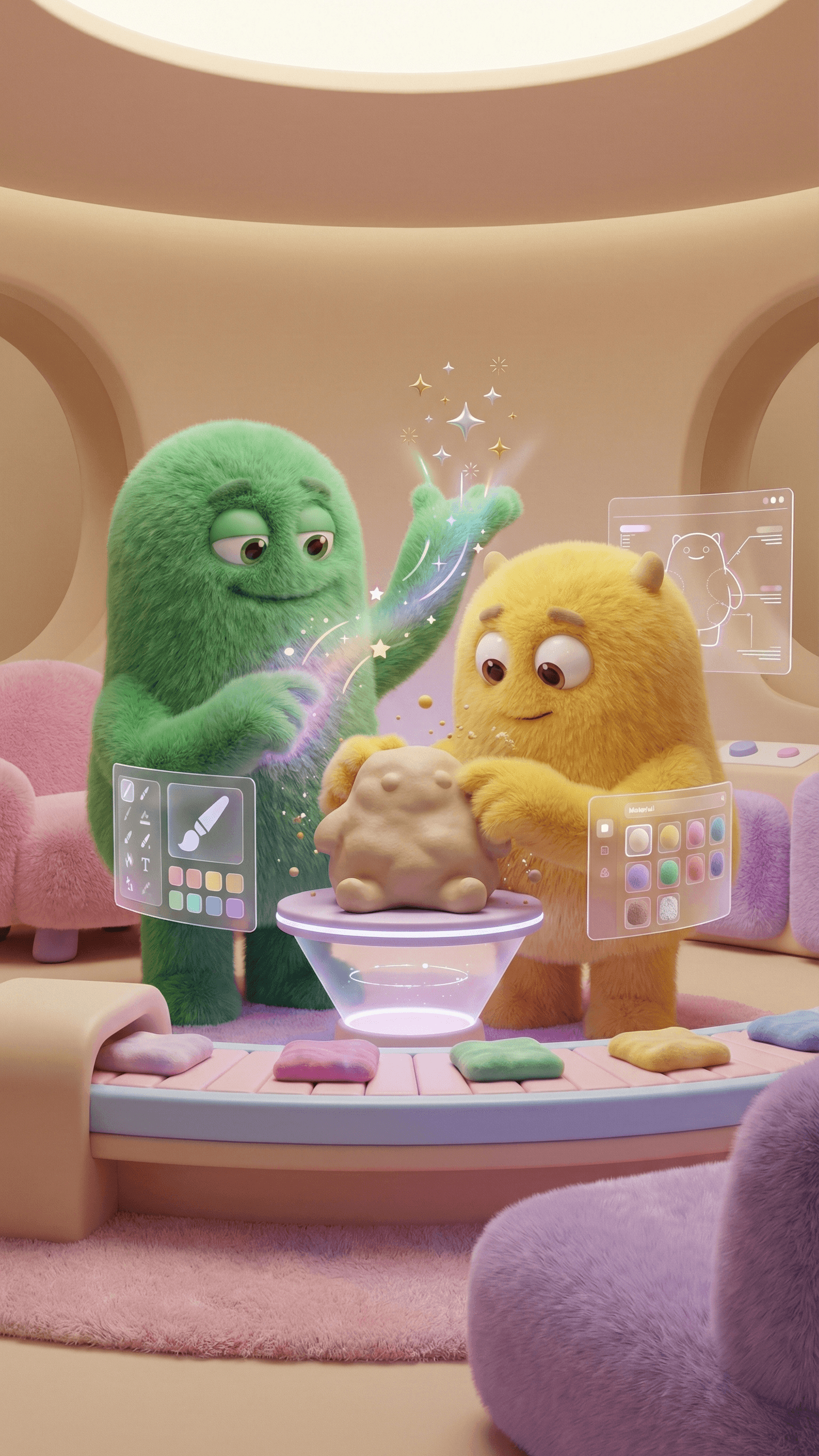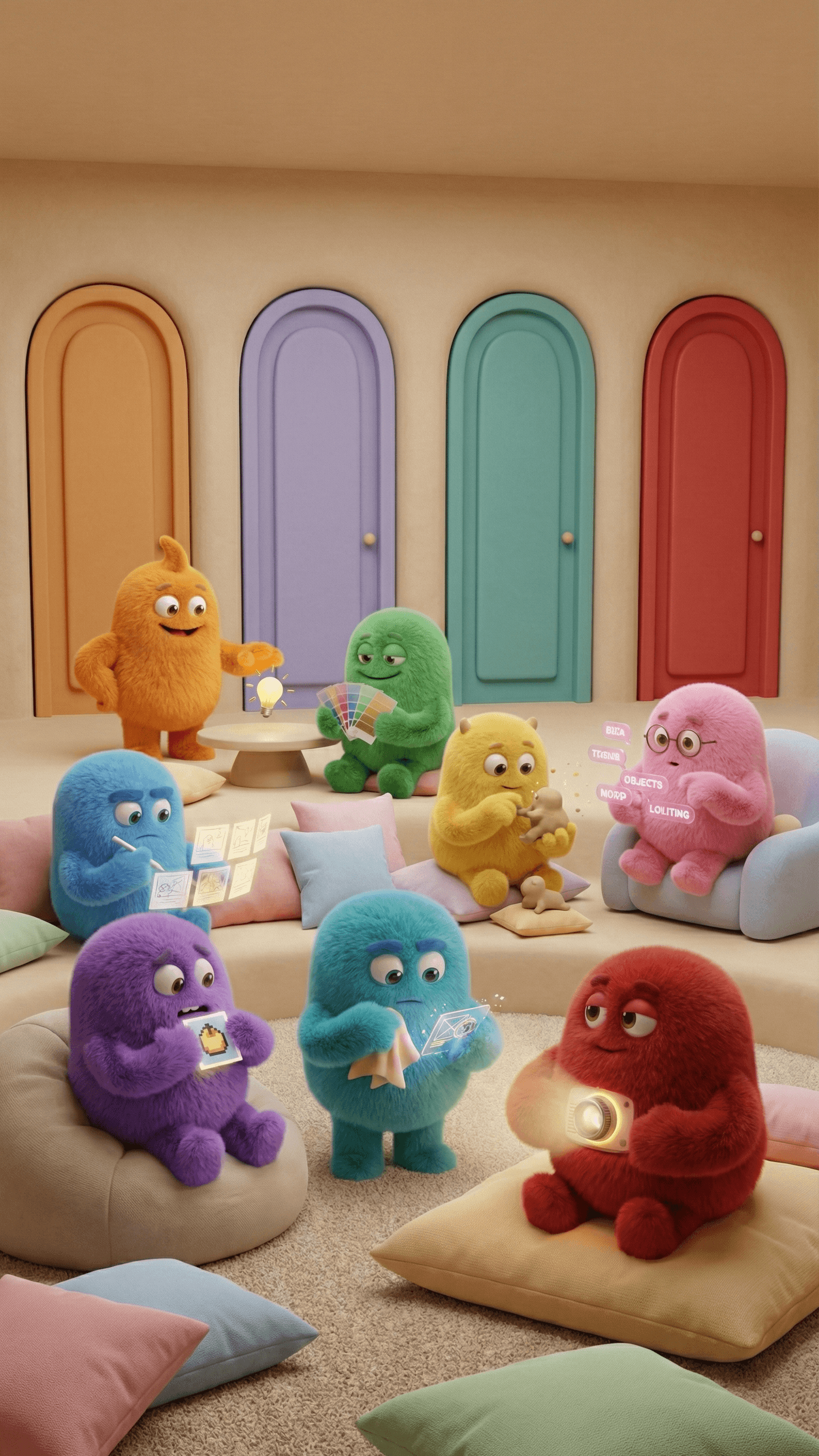 Creative Factory is a charming, story driven visual world designed to explain a creative AI workflow. The process is represented through adorable 3D fuzzy monster characters, each symbolizing a different part of the creative pipeline.