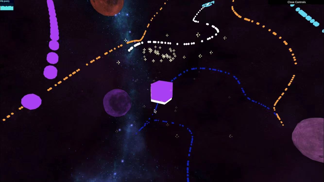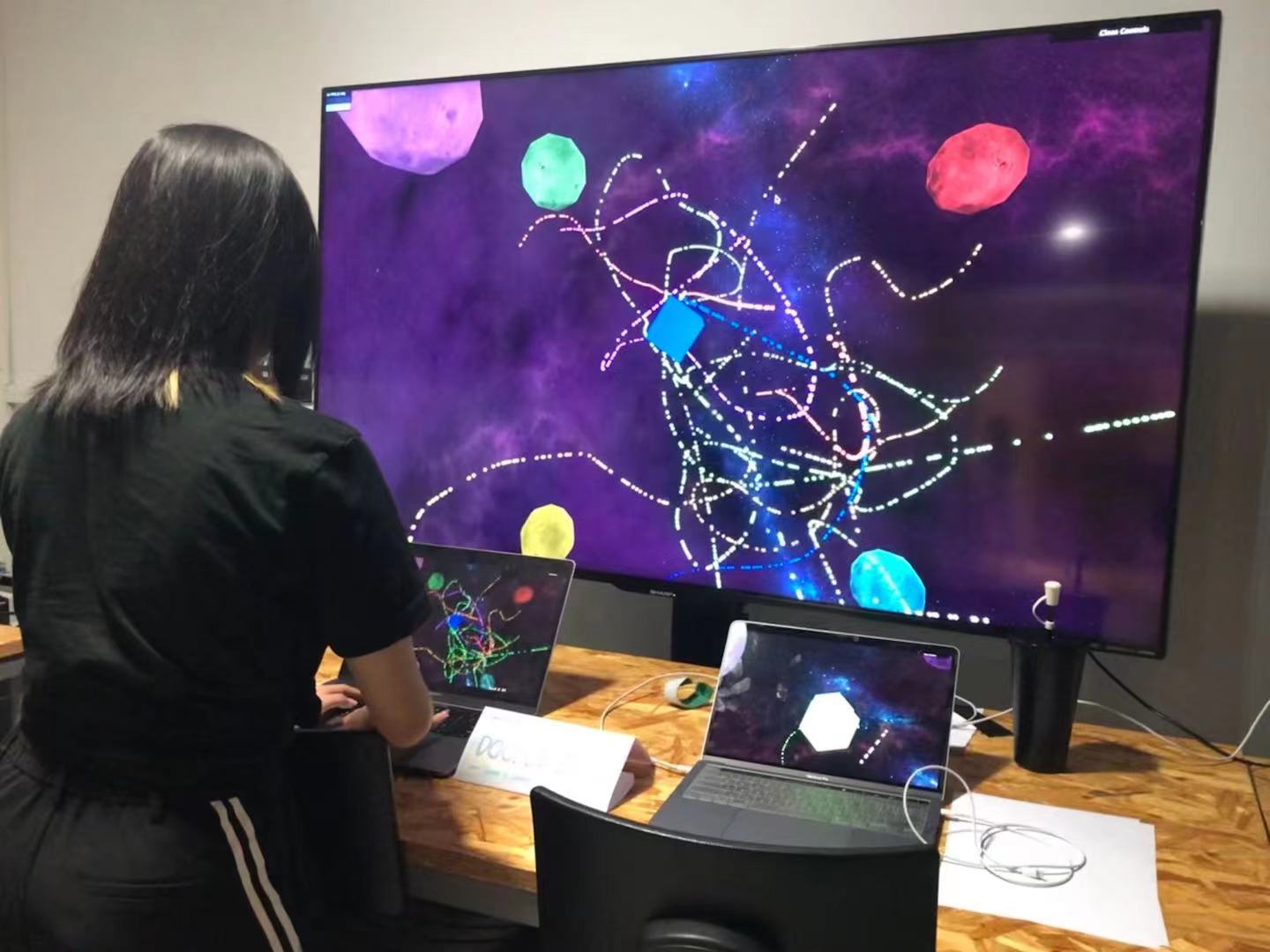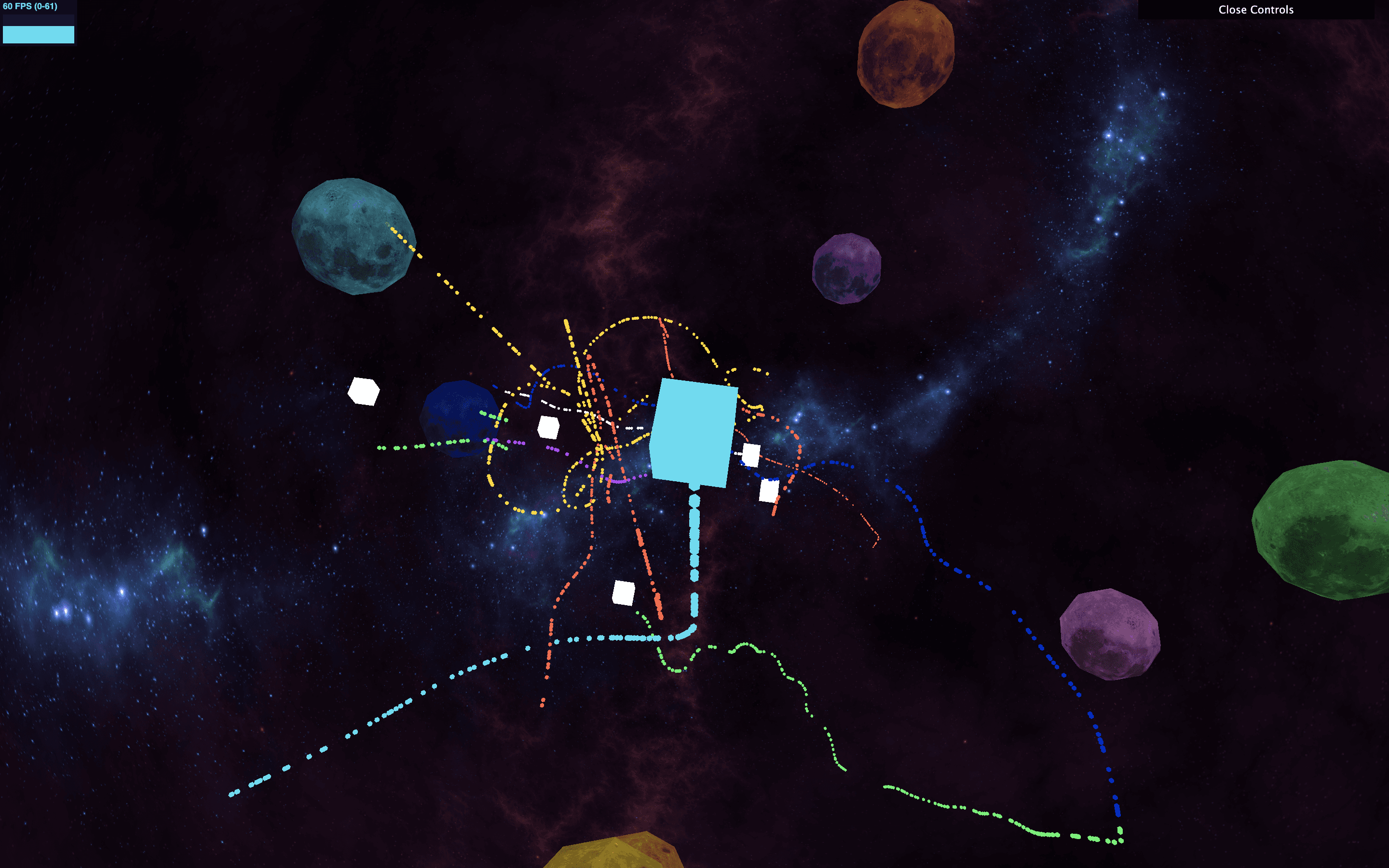 Doodle Space! is an interactive 3D space on website that allows users to create 3D artworks collaboratively. The user can use the mouse, the spacebar and “W”/”S” on the keyboard to control their cube. Each user’s cube will start with a white color, and the user can change the color by bumping into surrounding colored planets.