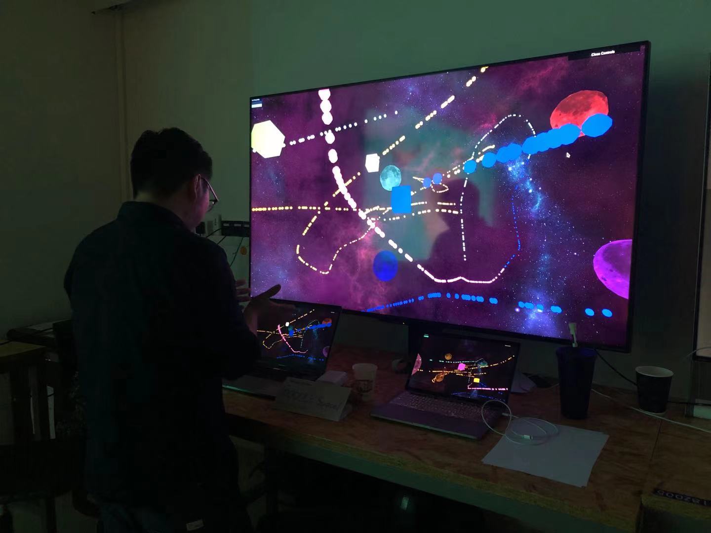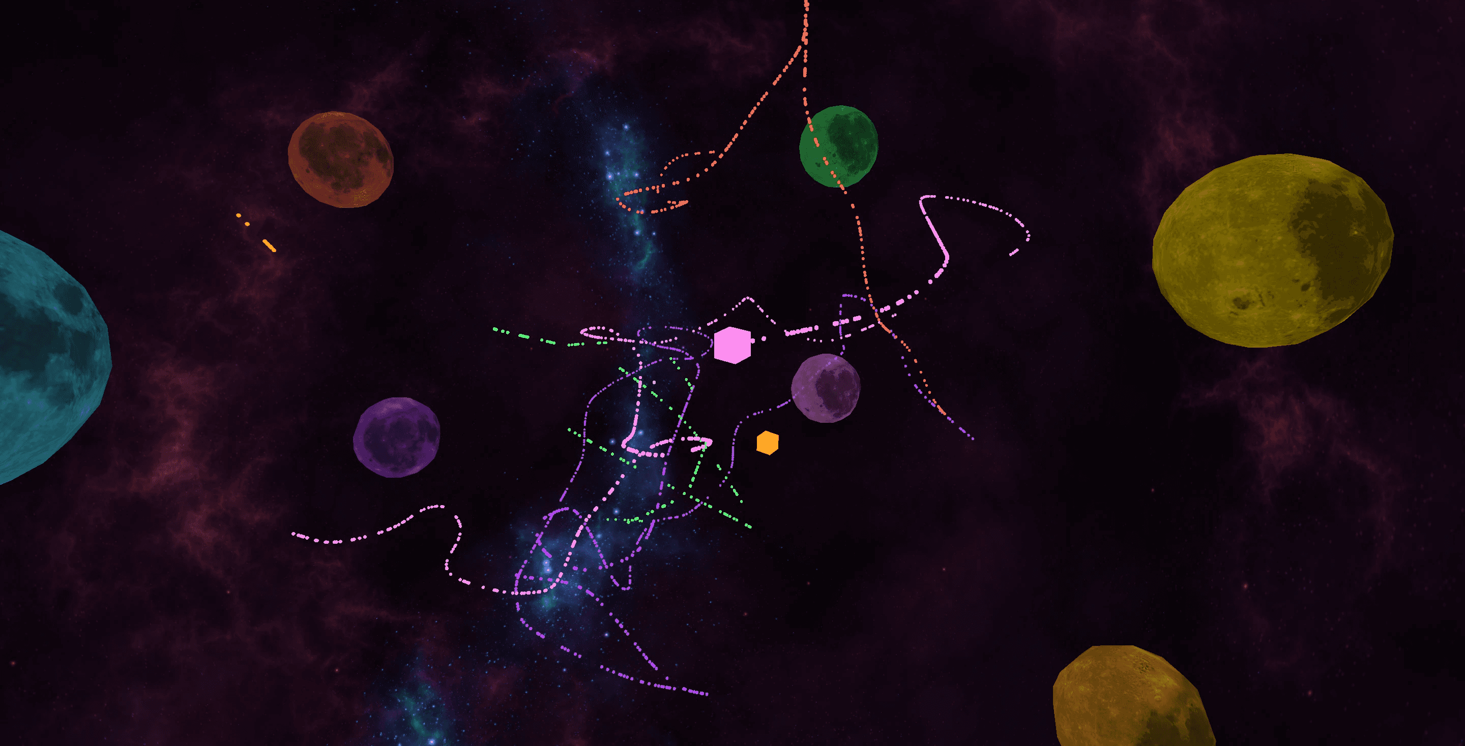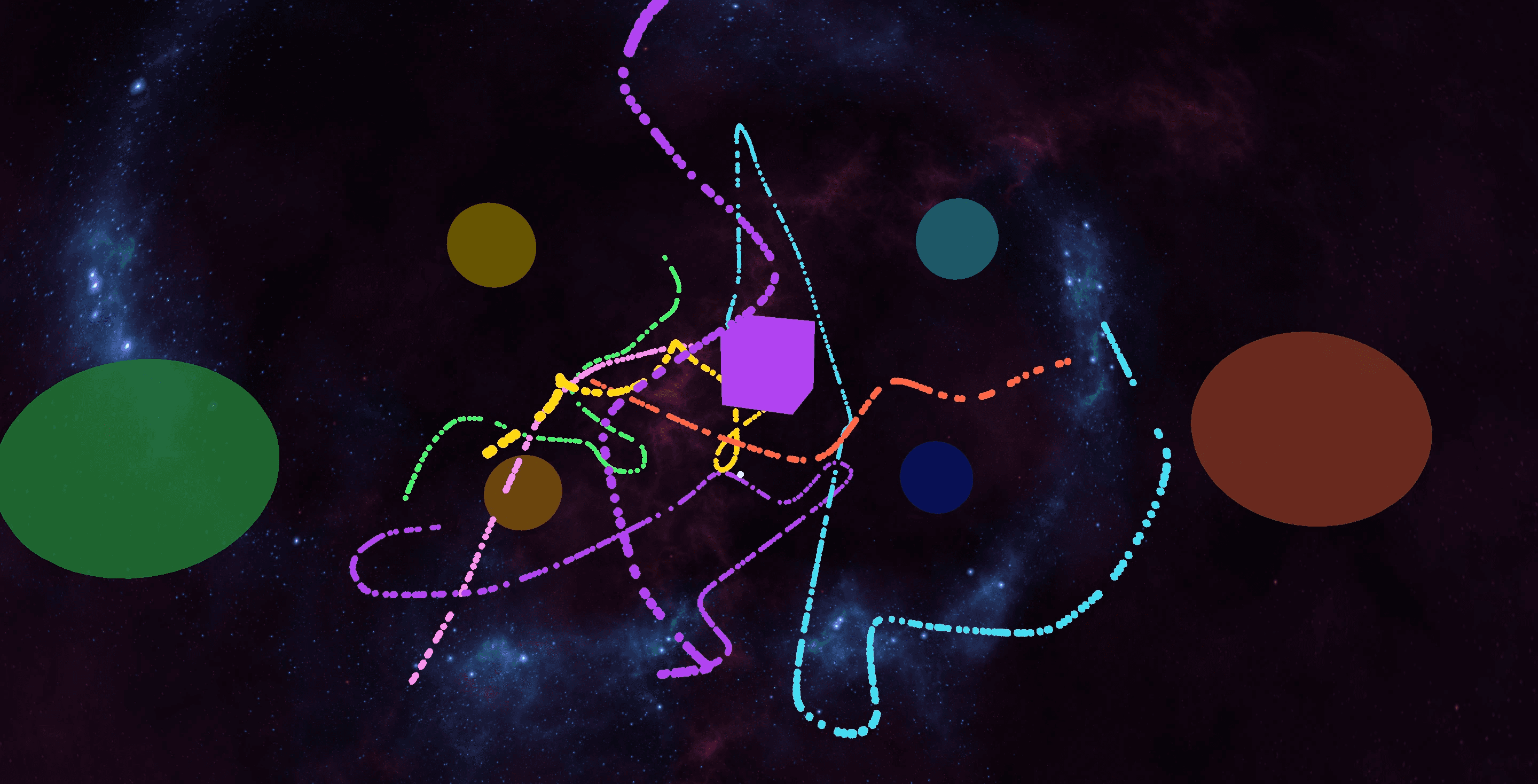 Doodle Space! is an interactive 3D space on website that allows users to create 3D artworks collaboratively. The user can use the mouse, the spacebar and “W”/”S” on the keyboard to control their cube. Each user’s cube will start with a white color, and the user can change the color by bumping into surrounding colored planets.