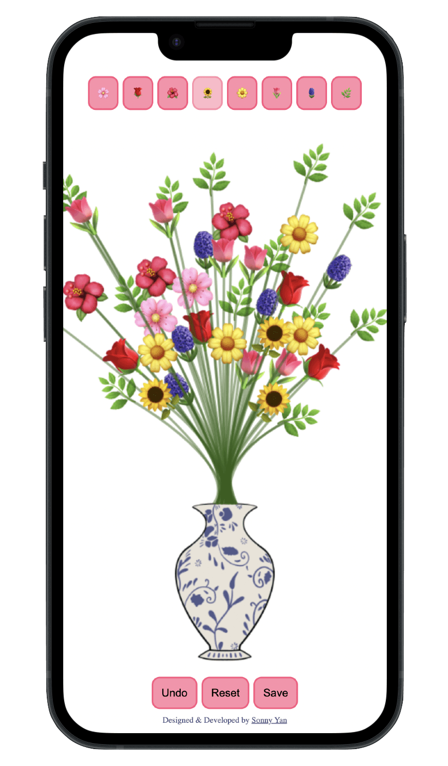 Created the structure with buttons for flower selection and functional controls (Undo, Reset, Save).